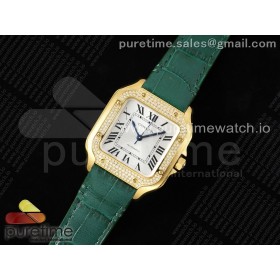 • 3K공장 까르띠에 산토스 미디움 35 옐로우골드금통 다이아몬드베젤 화이트다이얼 가죽스트랩 Santos de Cartier 35mm YG 3KF 1:1 Best Edition White Dial Diamonds Bezel on Green Leather Strap MIYOTA 9015