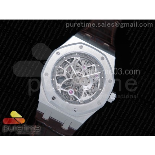 • 오데마피게 스켈레톤 투어빌론 스틸 브라운가죽스트랩 Royal Oak Fake Tourbillon SS Skeleton Dial on Black Leather Strap A23J