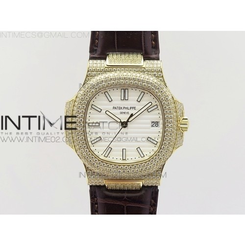 파텍필립 노틸러스 점보 5711 풀다이아몬드 옐로우골드 화이트다이얼 악어가죽스트랩 NAUTILUS JUMBO 5711 YG FULL PAVED DIAMONDS WHITE DIAL CASE ON BROWN CROCO LEATHER STRAP A324 > 파텍필립