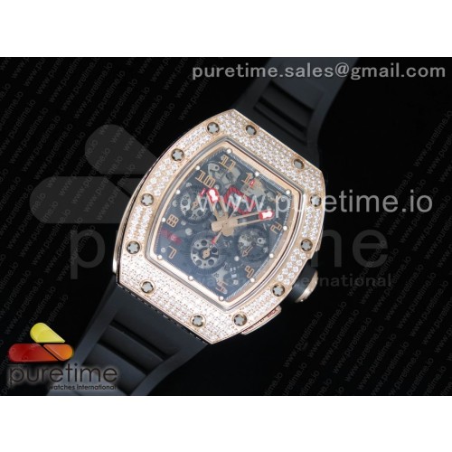 KV공장 리차드밀 크로노그래프 RM011 로즈골드금장 다이아몬드베젤 스켈레톤다이얼 러버스트랩 RM011 RG Chronograph Diamonds Bezel Crystal Skeleton Dial on Black Rubber Strap A7750