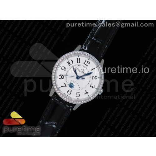 • ZF공장 예거르쿨트르 랑데뷰 화이트텍스쳐다이얼 다이어베젤 가죽스트랩 Rendez-Vous Night & Day SS White Textured Dial Diamonds Bezel on Black Leather Strap A898