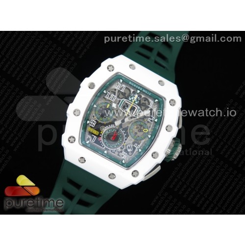 KU공장 리차드밀 RM011 화이트세라믹케이스 스켈레톤다이얼 러버스트랩 RM011 Real White Ceramic Chronograph Crystal Skeleton Dial Green on White Rubber Strap A7750 KV공장