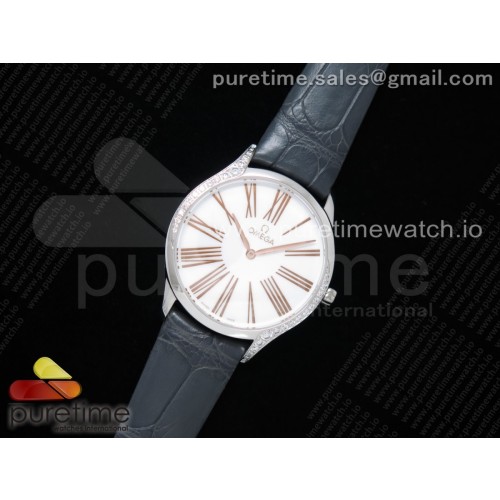 오메가 드빌 트레소르 퀴츠 화이트다이얼 블루마커 가죽스트랩 De Ville Tresor Quartz 36mm Ladies SS White Dial Blue Markers on Blue Leather Strap Ronda Quartz
