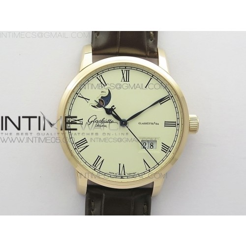V9공장 오리지널 엑설런스 파노라마 데이트 로골 화이트다이얼 가죽스트랩 Excellence Panorama 40mm Date Moon Phase RG White Dial on Brown Leather Strap A100 > 글라슈테